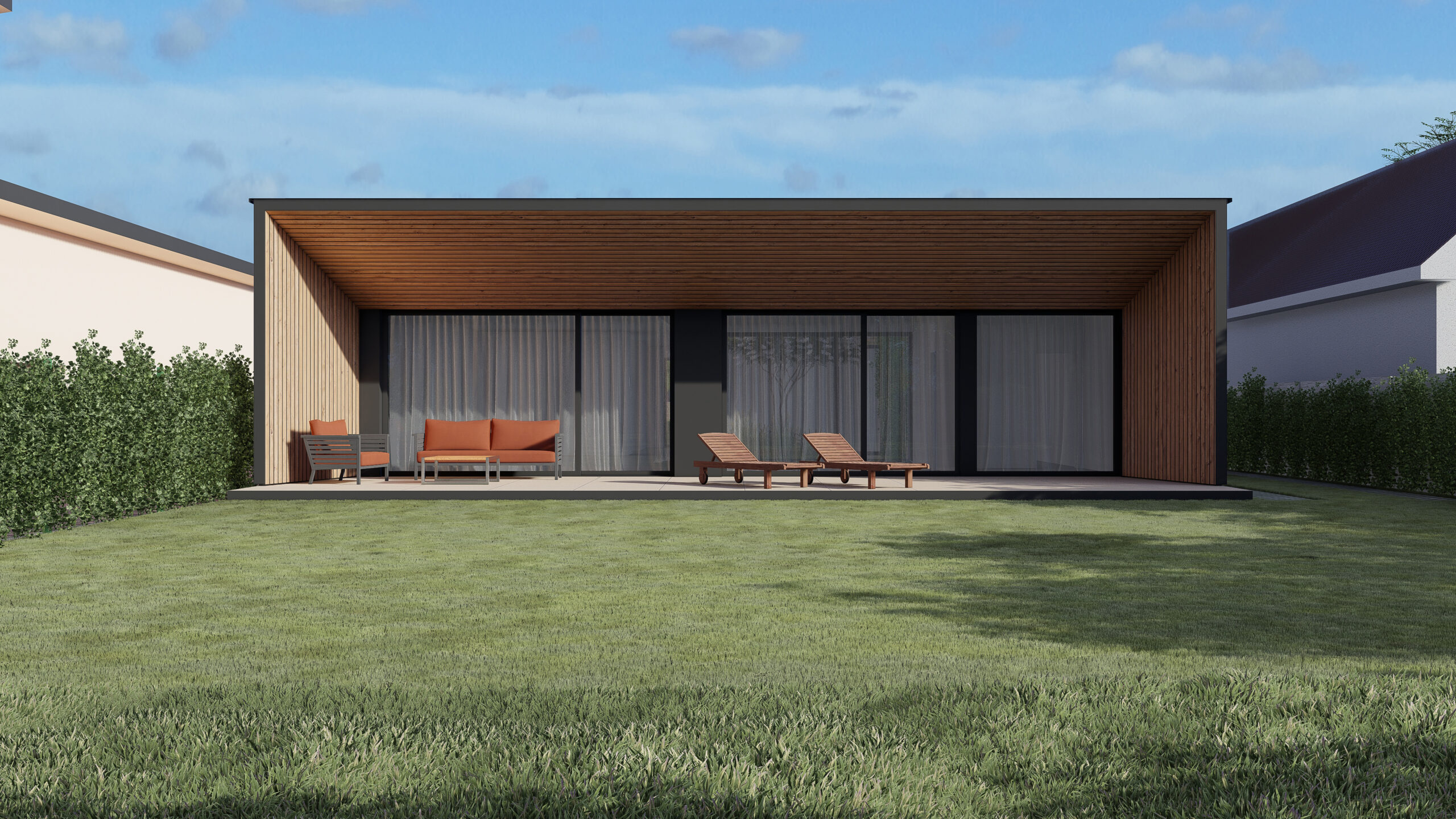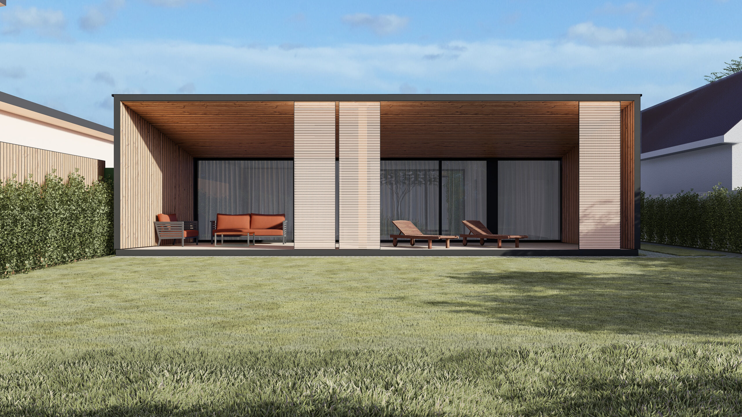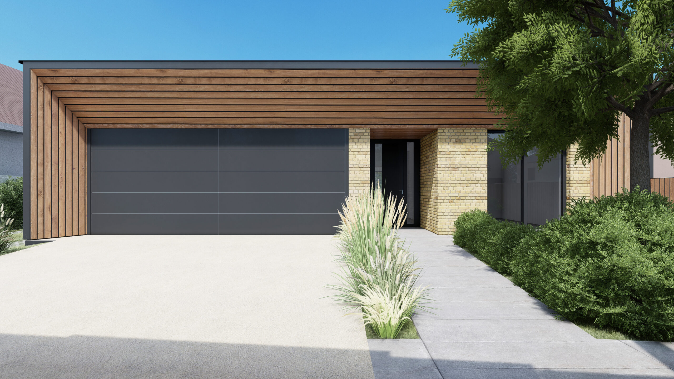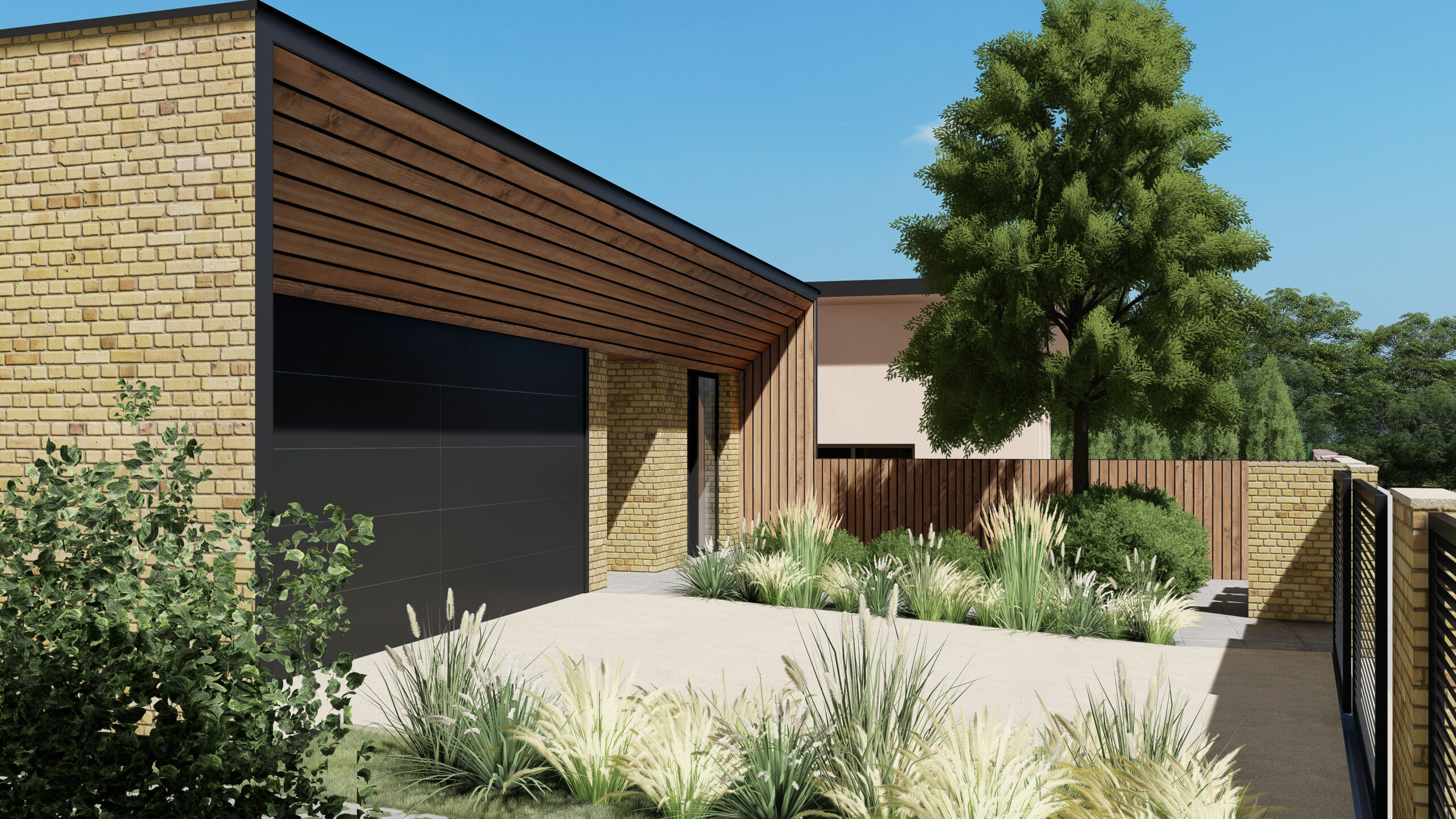 Fasáda je tvorená kombináciou troch silných materiálov: prírodnej tehly, dreva a hliníka. Akcentom na fasáde je skosené prestrešenie zadnej terasy a vstupnej časti.